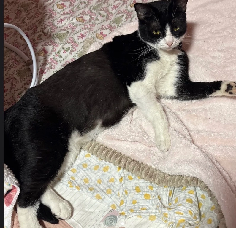 Female tuxedo cat spayed , right leg fully white & left leg is white on the foot area only. Around 3 years old