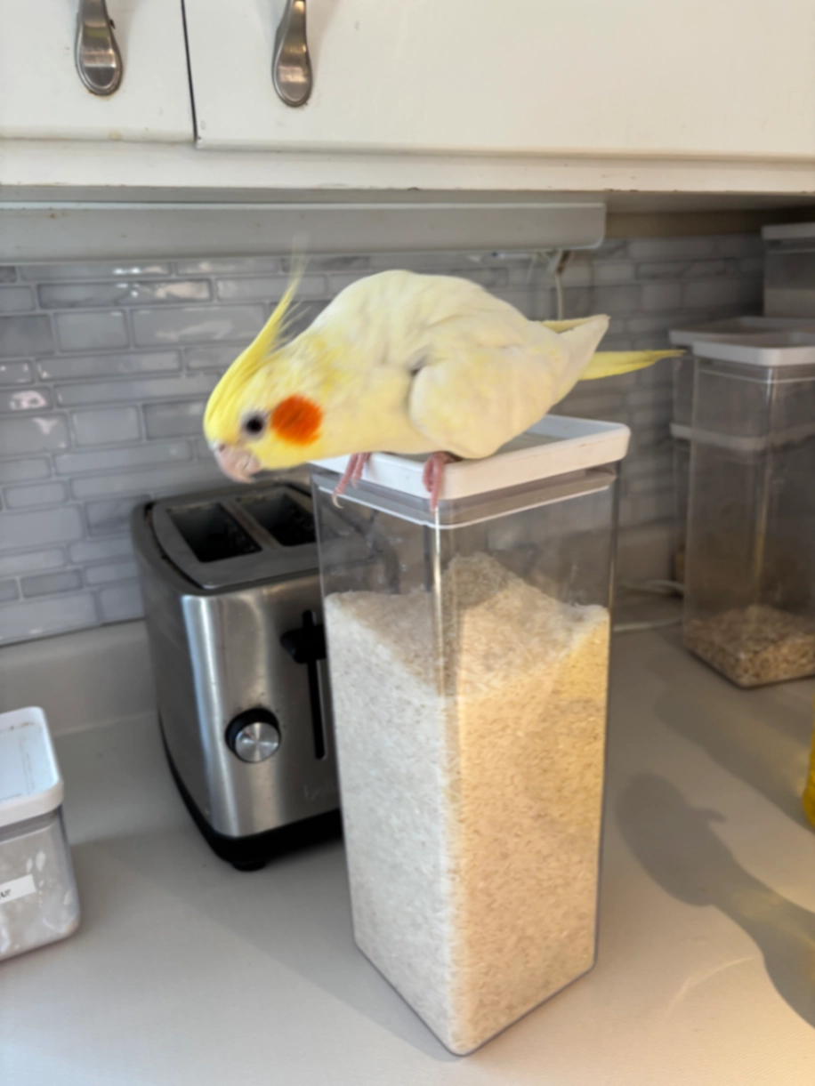 She is about 5 years old. All yellow with orange cheeks. Might be looking for a mate as it is the season. Likes to land on people’s heads.