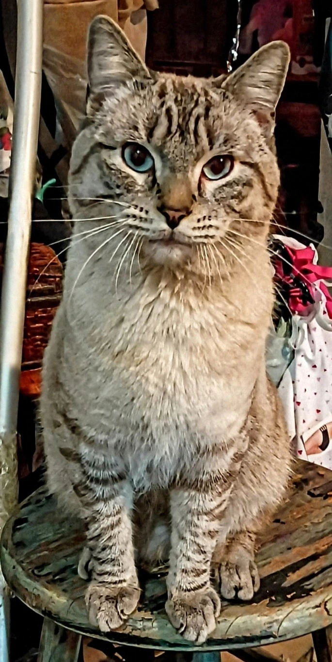 Siamese lynx point. Grey and white with stripes on his back and legs. White neck and chest, white mittens. Long dark grey fluffy tail. Blue eyes. He’s skittish, and is an indoor cat. Not chipped yet.