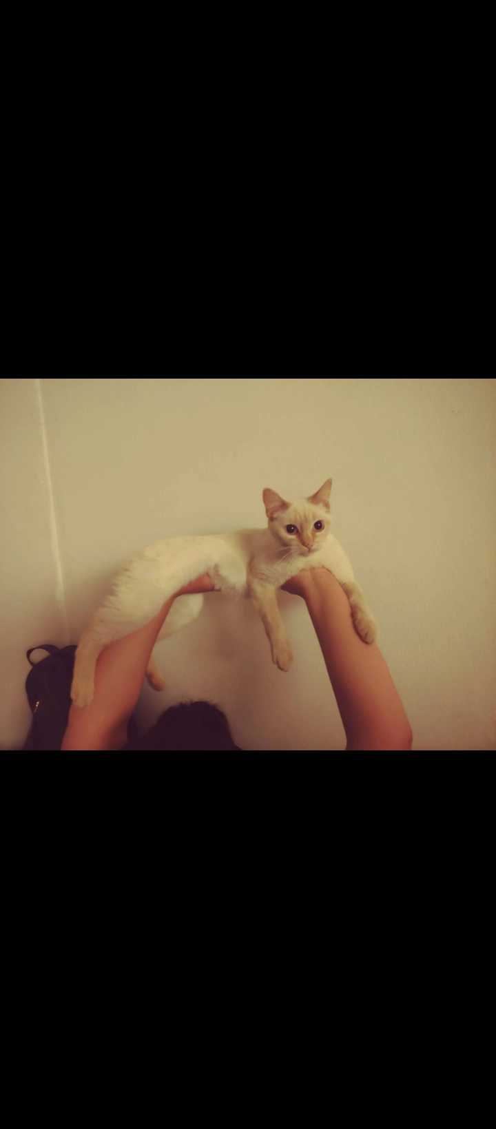She is white with brown-orange ears, paws and tail. Her tail is crooked from when she was found by my cousin. She has light blue eyes and a pink nose with black spots.