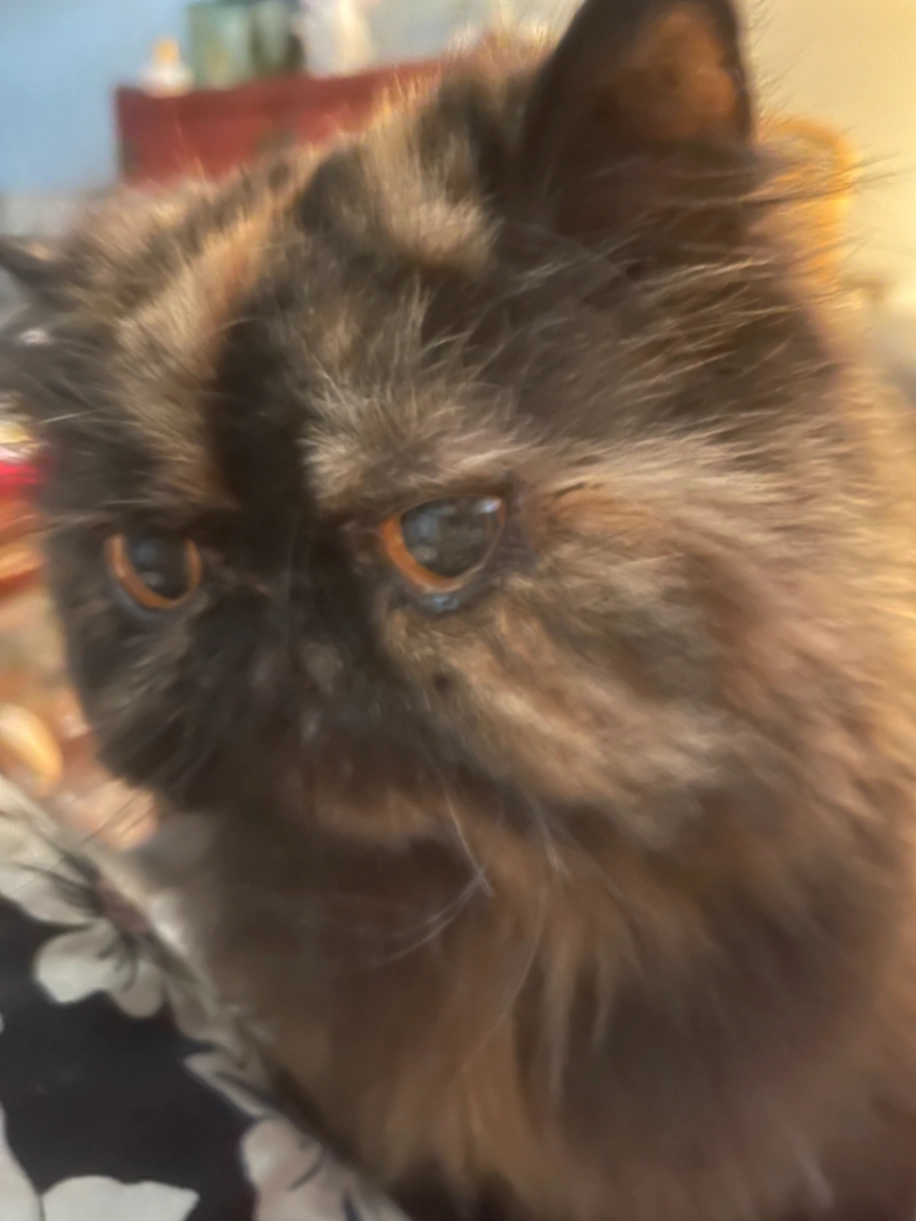 Tortie Persian Cat 12 years old. Friendly but skittish. Microchip 600003580