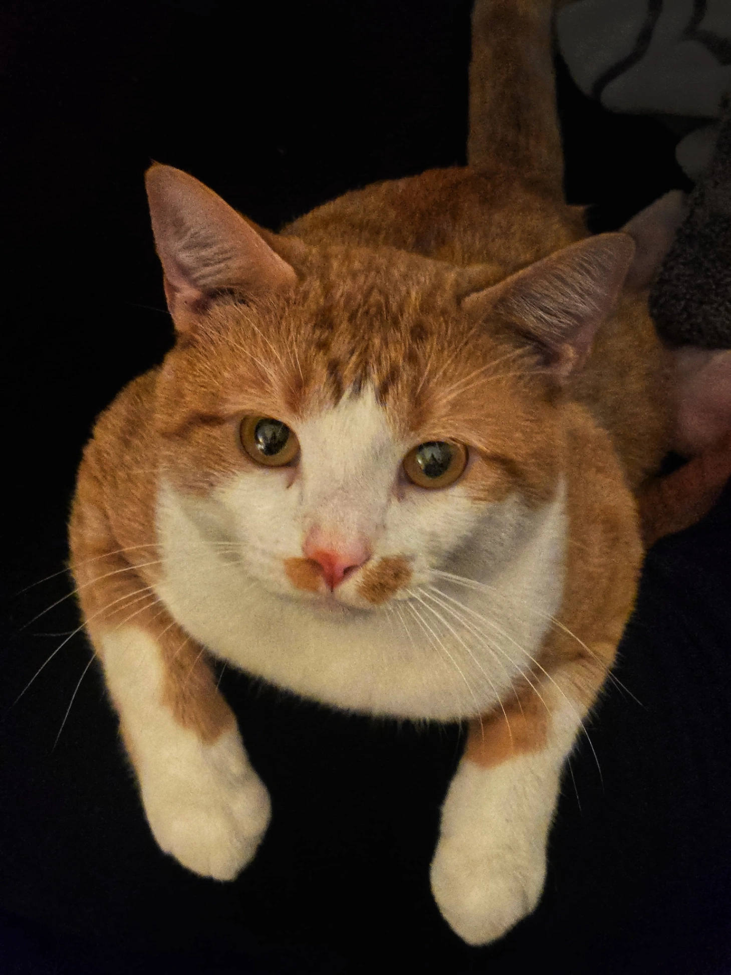 He is small, he jist got neutered so be careful with his abdomen, he responds to his name and he'll come to the sound of treats or the opening of a can