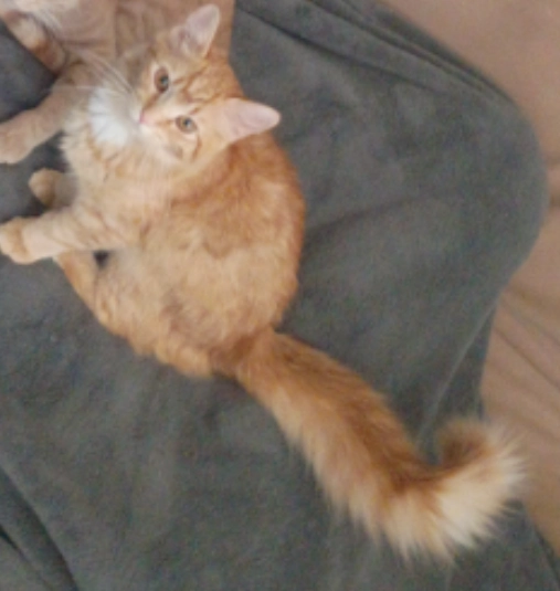 Indoor cat, has dark orange stripes on sides, BIG floffy tail, and white spots on her tummy and chest