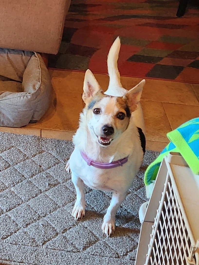 Small black and white - jack Russell/rat terrier mix- female/ 14 years old. Missing 1 eye. Very sweet & will approach anyone