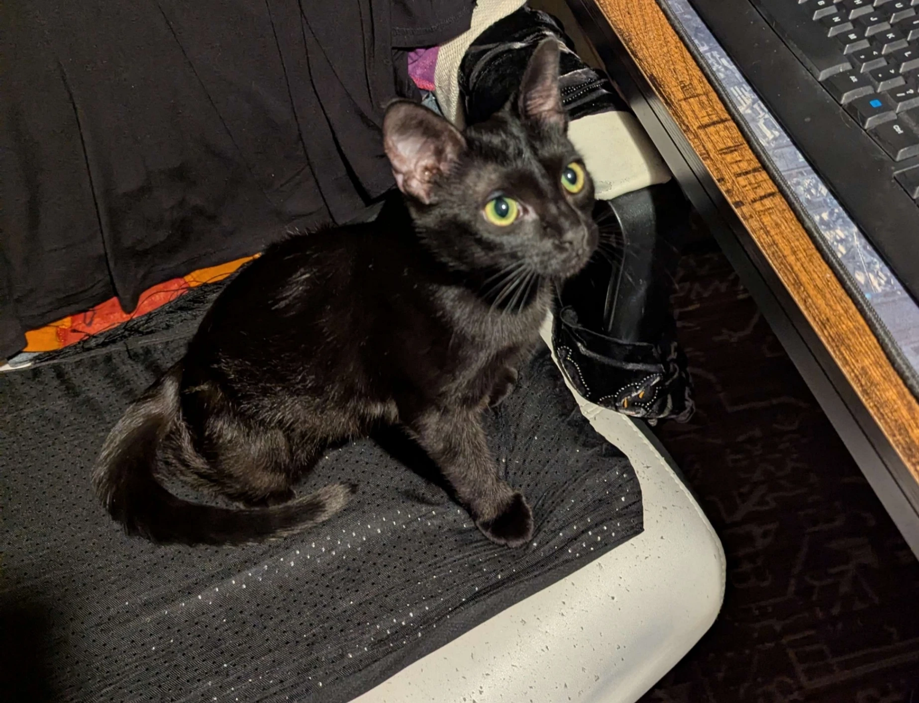 Solid black. Female. Spayed. about 7 pounds. 1 year old.