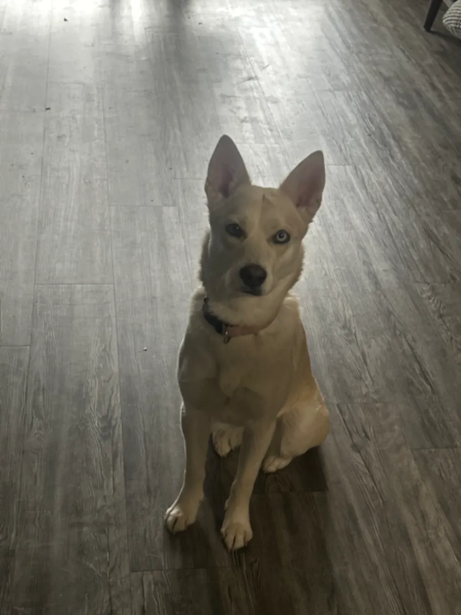 Zennigatta: White Swiss Shepard Pitt mix, floppy ears, sad brown eyes, white fur. Wears a green collar with an orangish red stripe. Shy, skittish, but sweet.