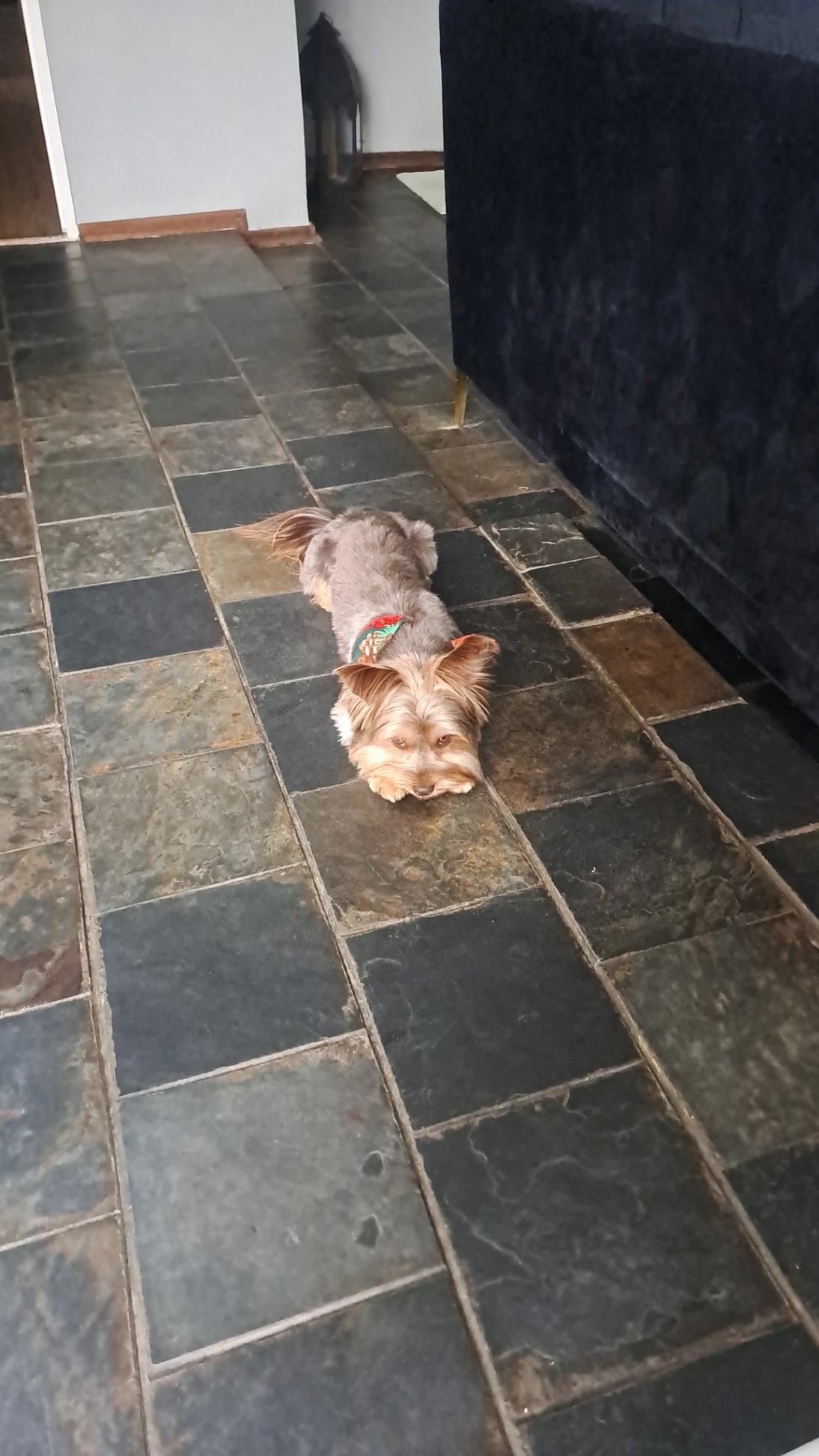 Chino is a 2 year old male Yorkie,brown and golden hair,he has a green bandana around his neck.