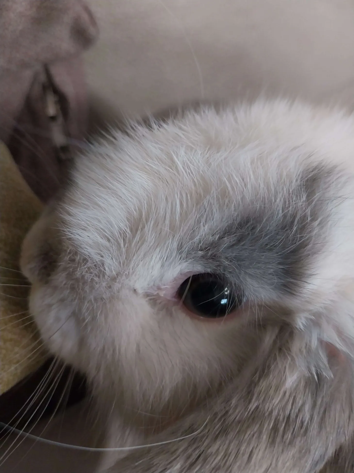 White and Grey spots about 8 months old, big and a little fat, very gentle, reacts instantly to loud noise