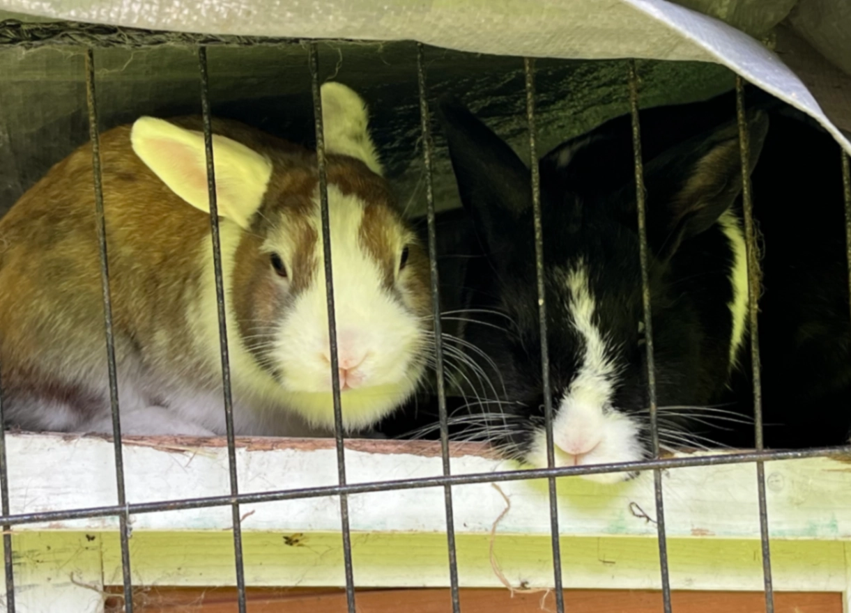 Lizzy: klein konijntje bruin-wit, vrouwtje. Dropje: groter dan Lizzi, zwart-wit mannetje.