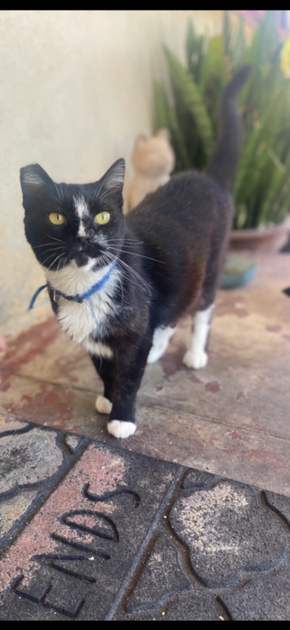 He has a very low raspy meow. He was wearing a blue collar with his name and my phone number