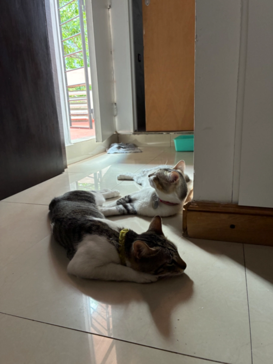 Tiene un collar rojo. Macho, de un año, sin castrar aún. Color blanco y gris alimonado. Cuello blanco