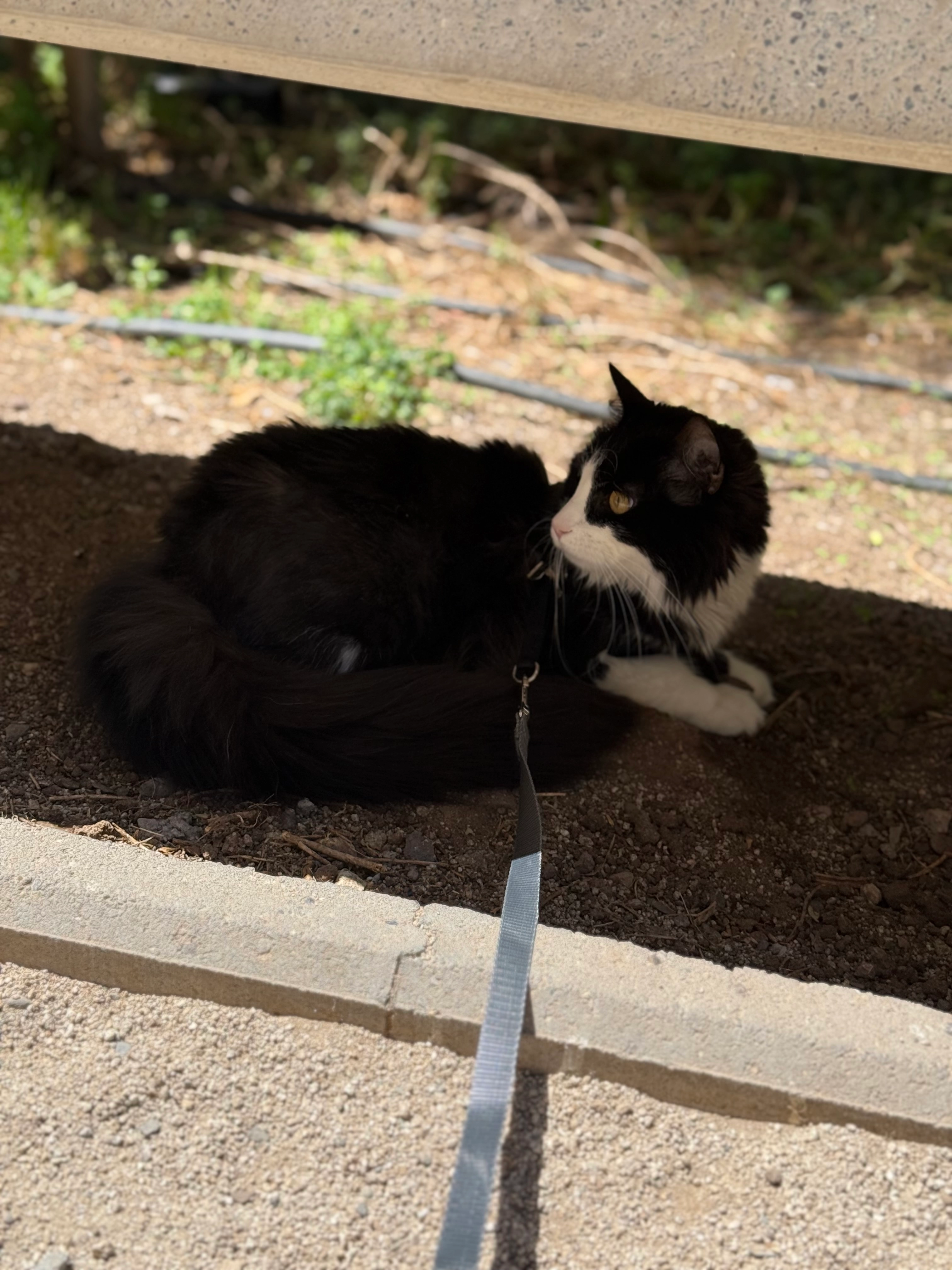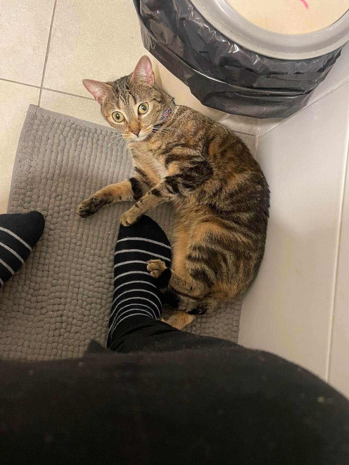 Gata blanca con manchas grises y naranjas vista por última vez en el patio de su casa