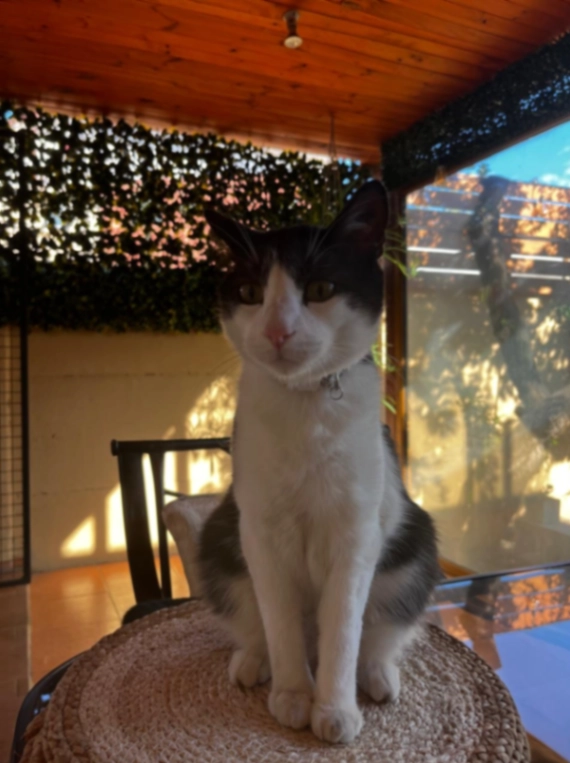 Es blanco con negro, tiene la colita mas corta de lo normal, anda con un collar celeste y tiene unas suturas en su pata trasera de una herida que se hizo.