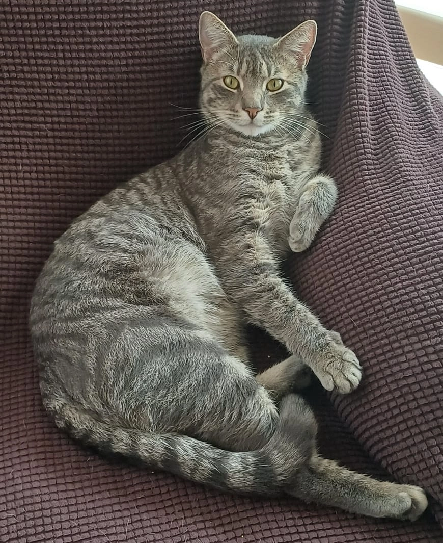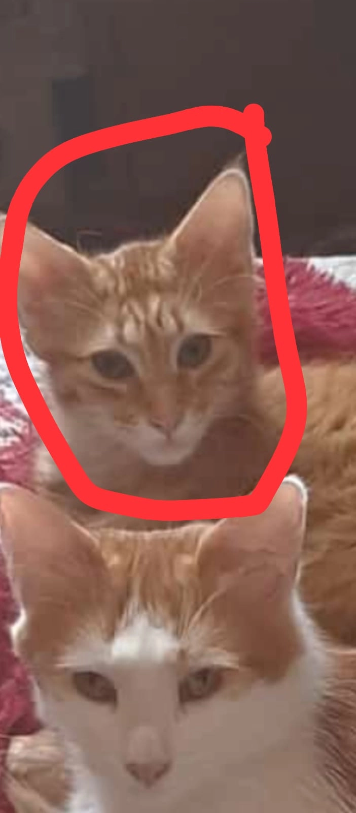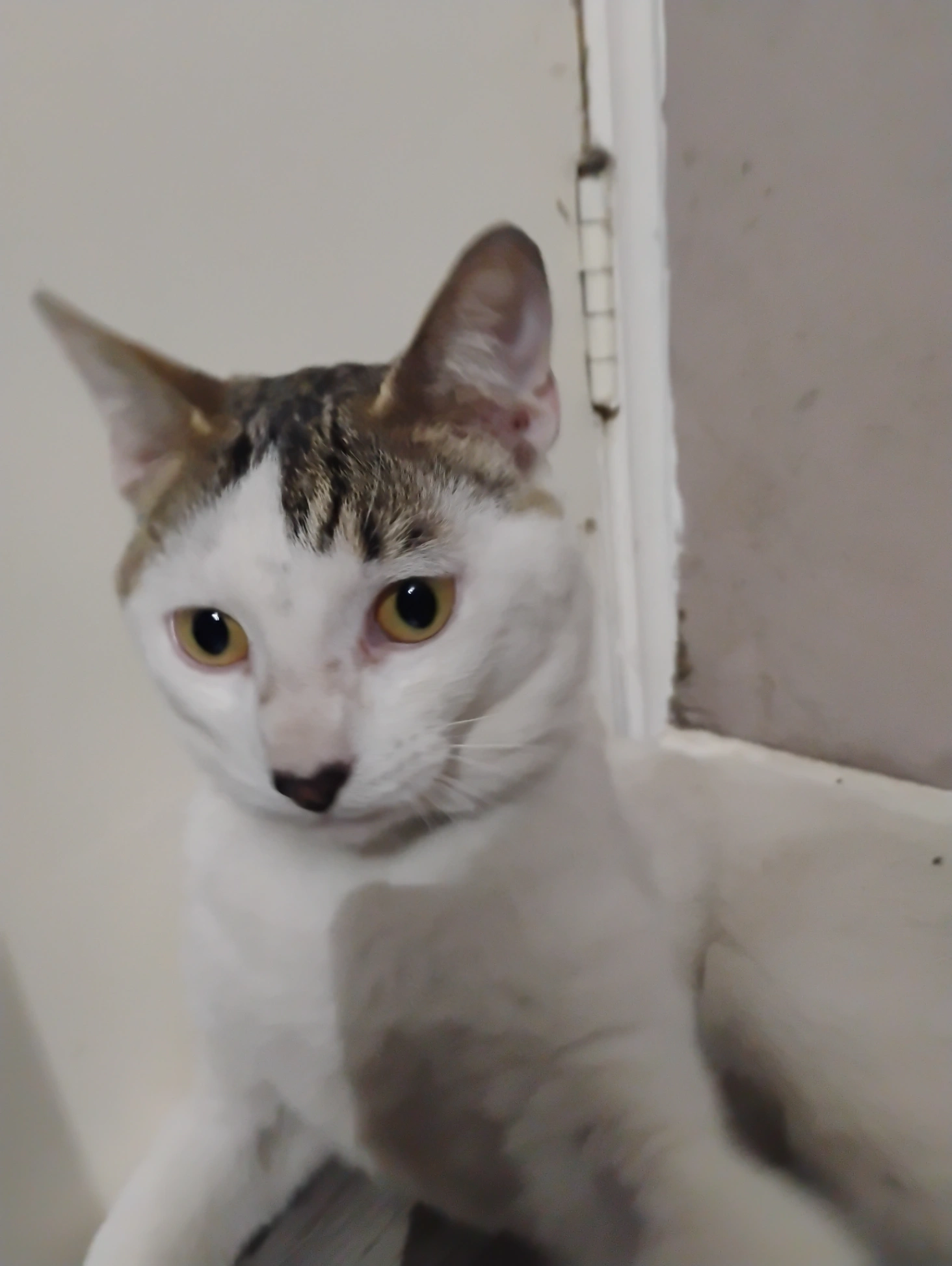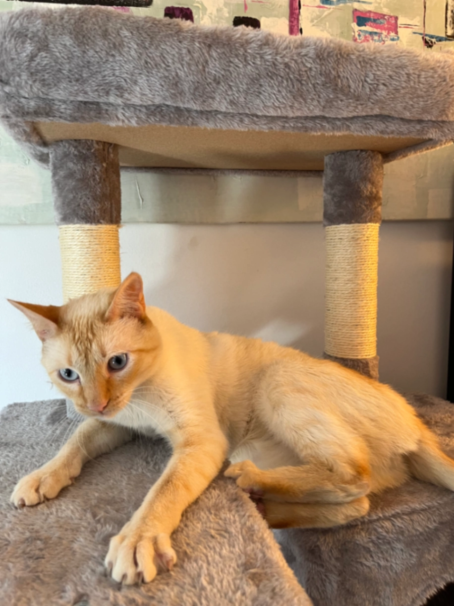 Gato color amarillento, amigable, ojos azules, tiene microchip