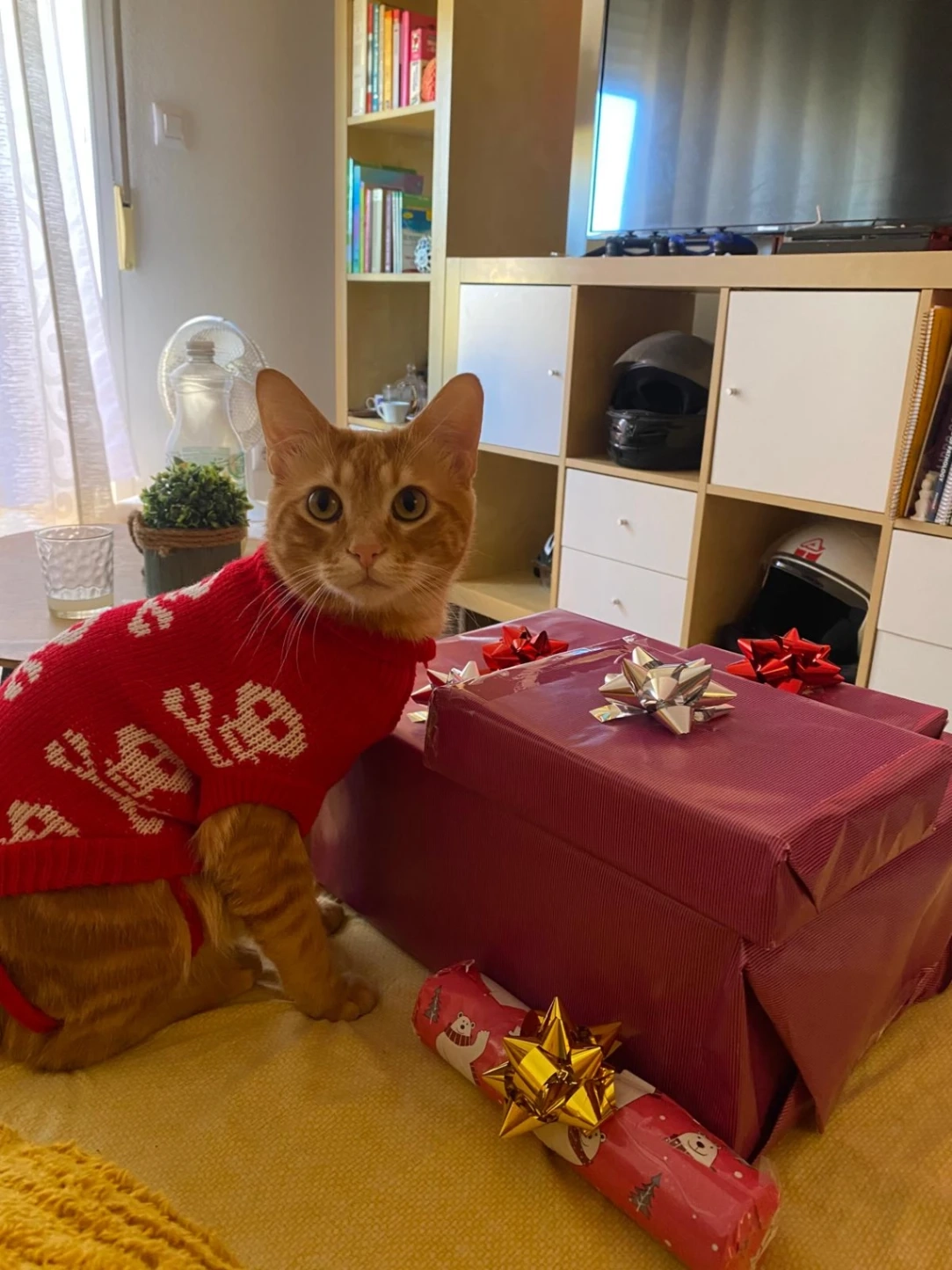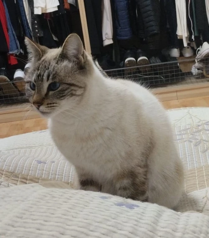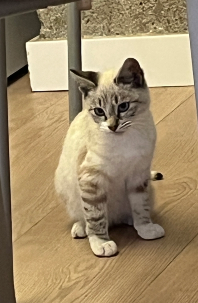 Tiene 4 meses y medio y una mancha blanca en la punta de la cola. Ojos azul claro, es clarito y con rayas grises en la cabeza, patas y cola.