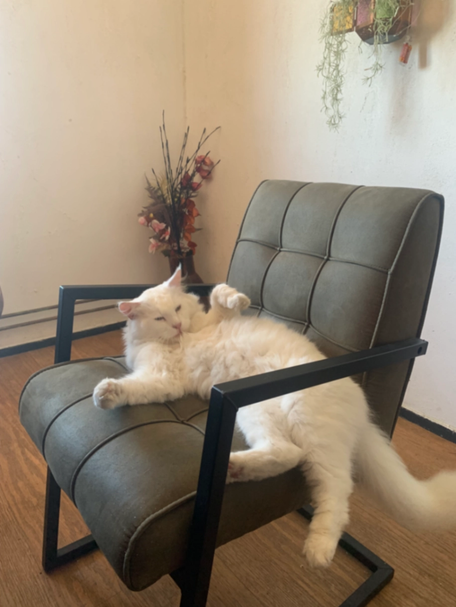 Cypers bruin/zwarte kater, bruin neusje, witte bef, wit vlekje op de buik. Voorpootjes witte teentjes, achterpootjes witte sokjes. Bovenin de voorpootjes twee donkere horizontale strepen. Zwarte staartpunt.