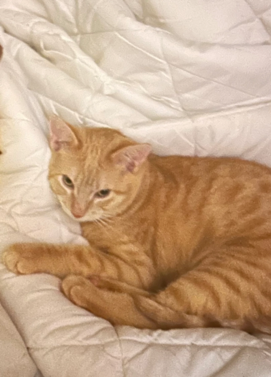 6.5 yr old orange male tabby. Very friendly. Defining characteristics are dark spots on nose, and mouth area.
