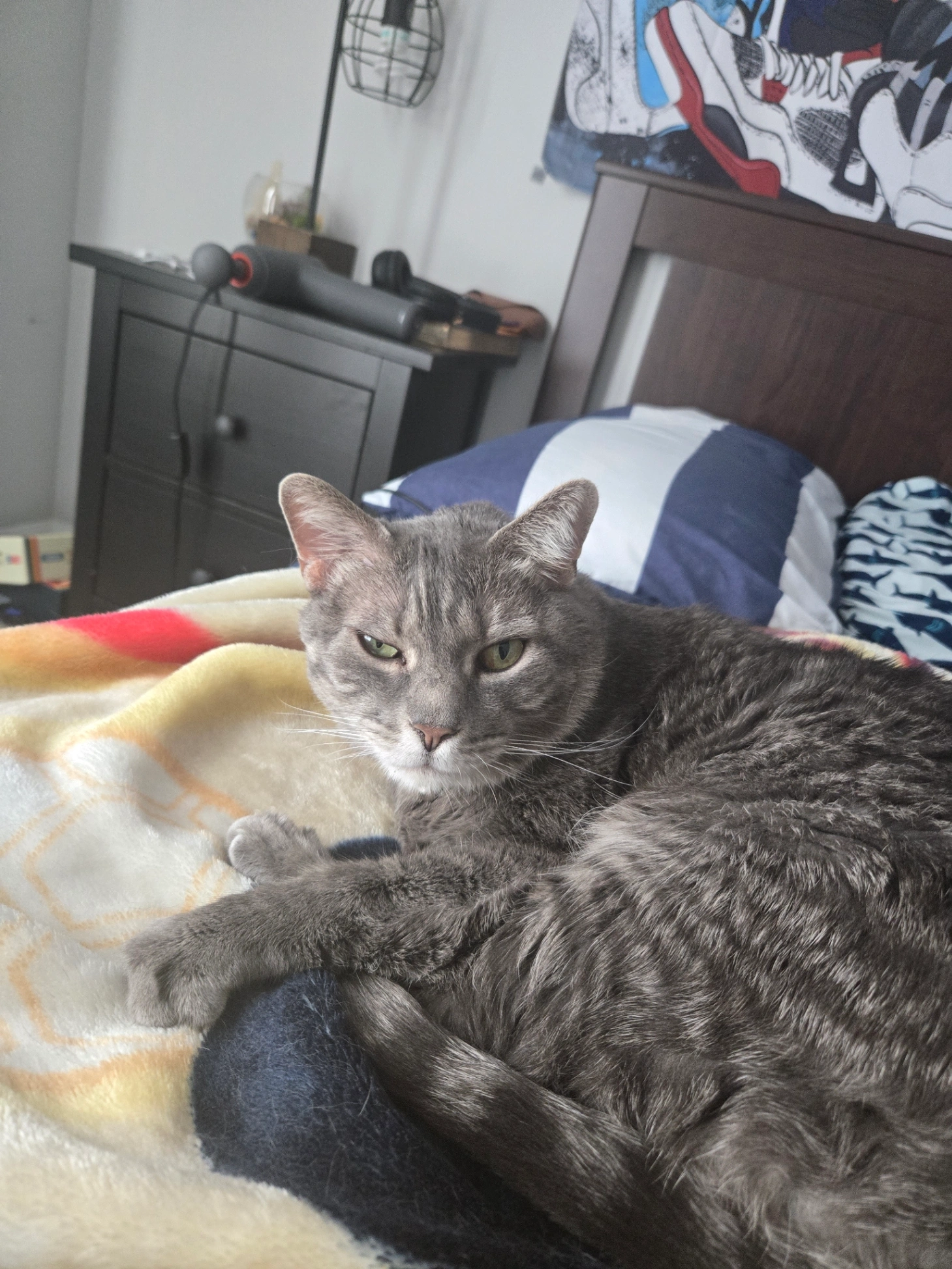 all gray female cat. 10lbs. golden eyes. may be skittish. no collar because she is a house cat.