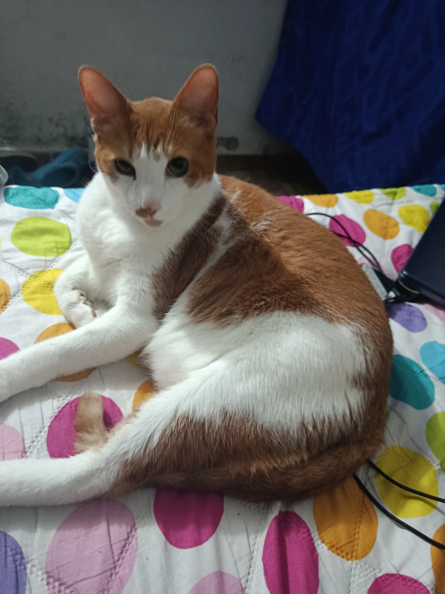 Colo beige con blanco , y ojos azules , tiene 8 meses