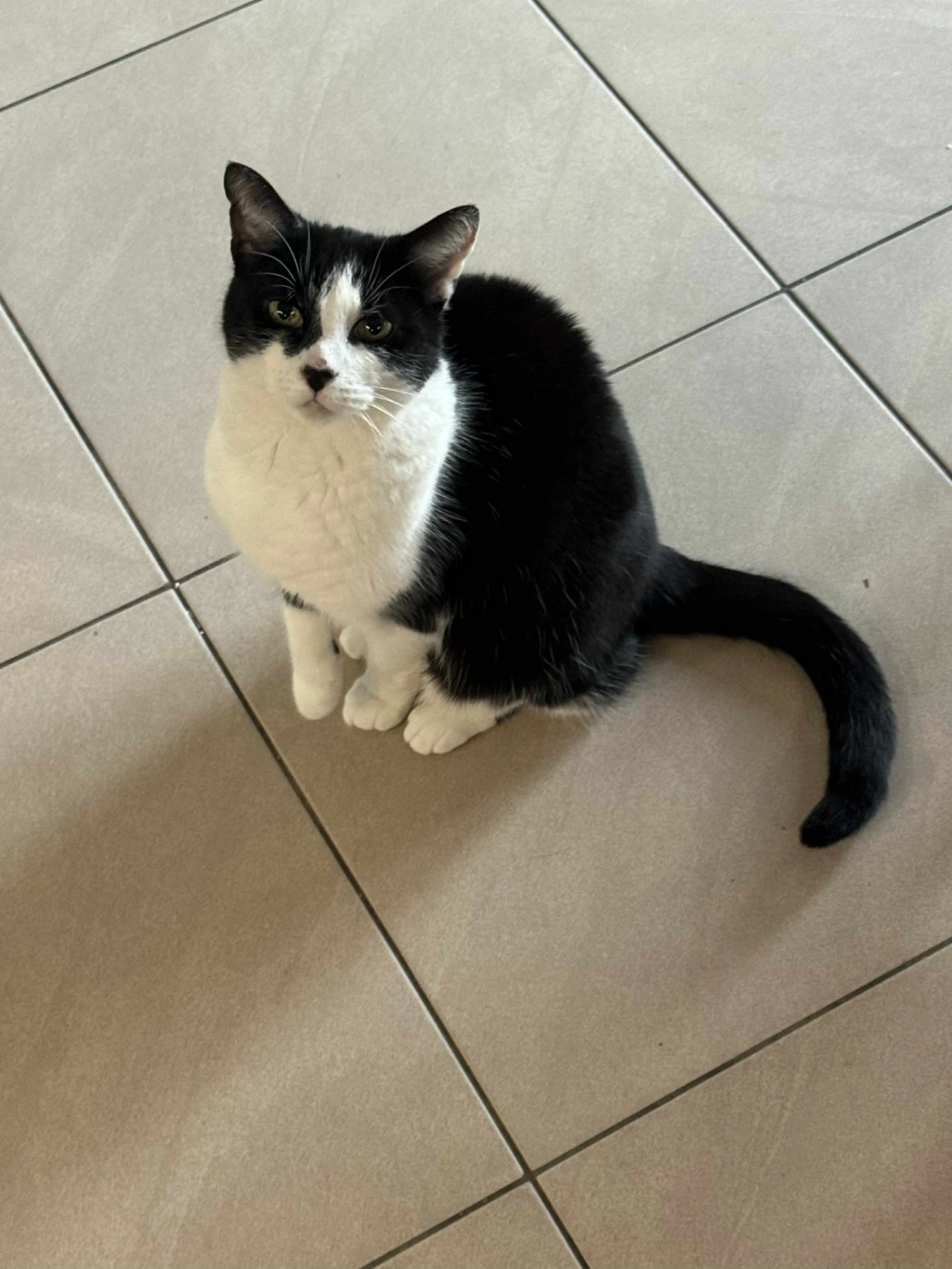 Long white cat with black patches and striped tail