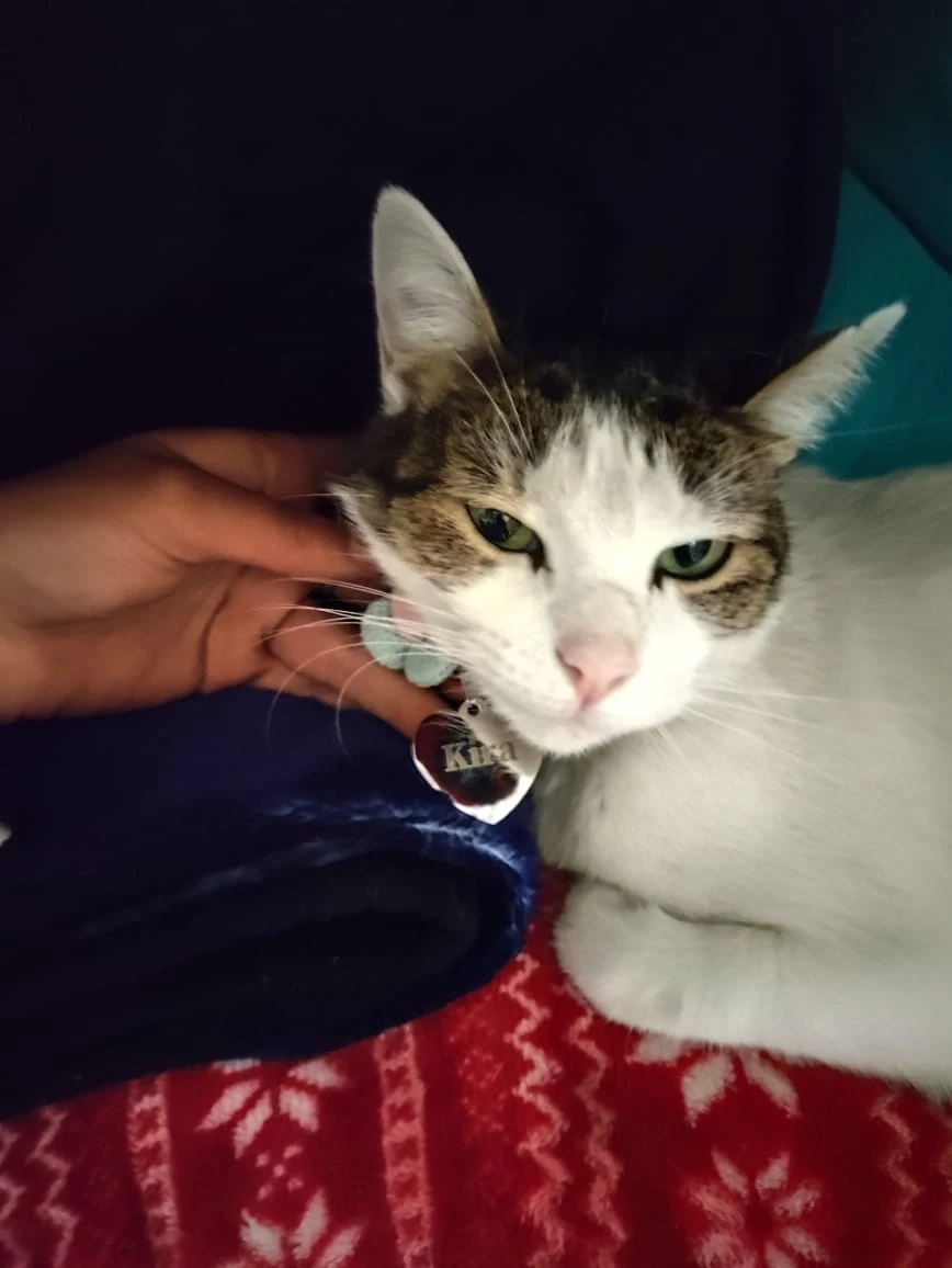 Gatita blanca con manchas grises en cabeza, cola y a un costado del cuerpo, usa un collar verde menta con una flor y portaba una placa con su nombre y número de contacto