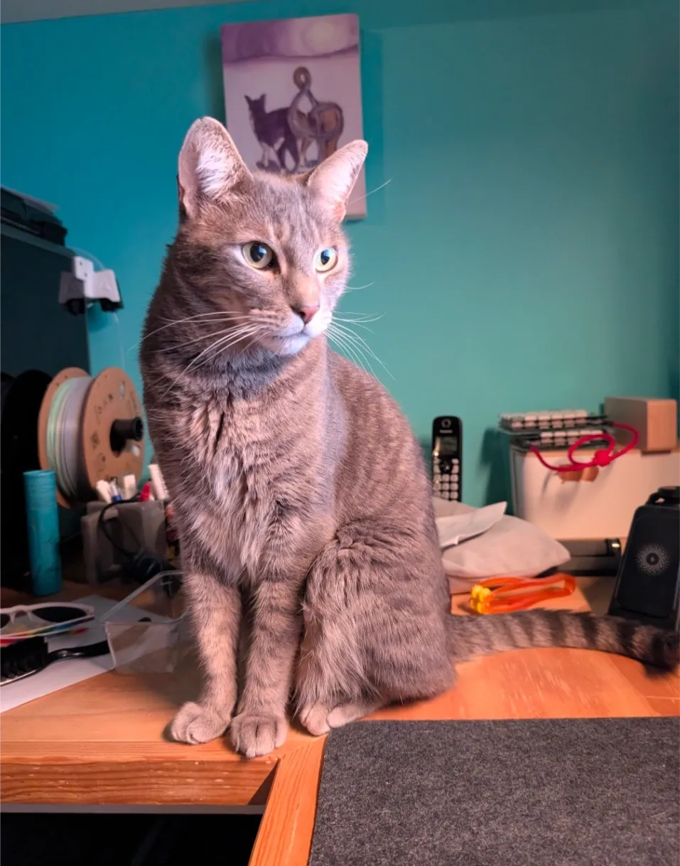 Rico, gato macho adulto de 9 años color gris y ligeramente rayado (a la distancia se percibe más como color gris solido). Tiene una ligera muesca en la punta de la oreja derecha por un rasguño y le falta el colmillo inferior derecho. Es muy dócil y sociable.