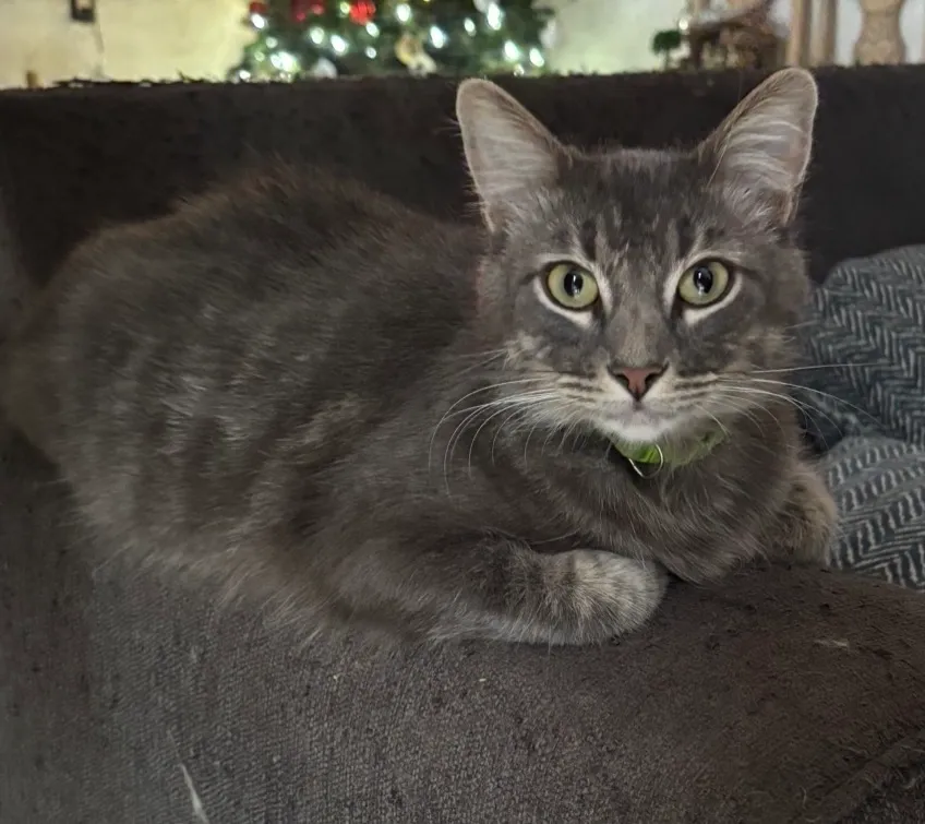 Macho, 2 años, color gris atigrado. Bigotes largos y blancos. Pelaje esponjado, en especial en la cola. Usa collar verde.