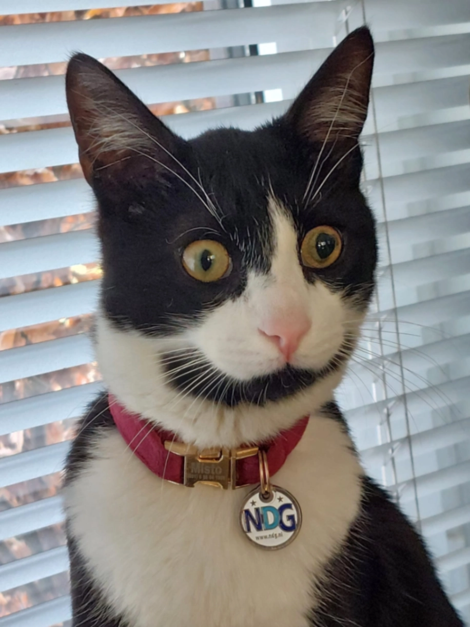 Zwart en wit poes die heel lief en nieuwsgierig is. Hij heeft zijn naam “Misto” en mijn telefoonnummer gegraveerd op zijn halsbandje.