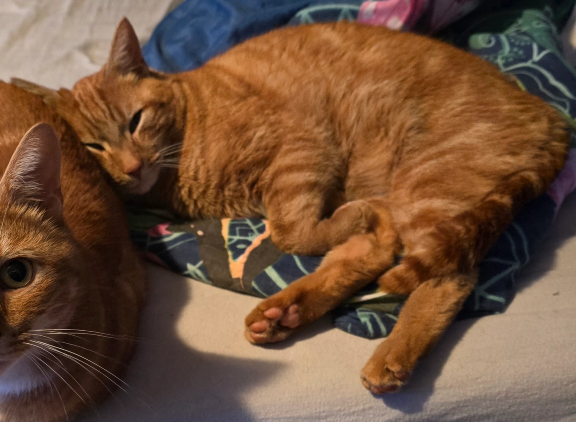 Donker rode gecastreerde en gechipte kater. Zonder aftekeningen. Als hij miauwt heeft hij een soort zachte klagelijke schorre miauw. Onze lieve knuffelkat Willem wordt al 3 dagen vermist.
