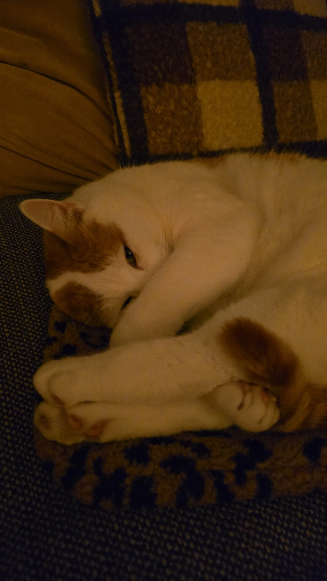Grote kater. 3 jaar. Wit met rode vlekken. Witte streep op kop. Gestreepte rood witte staart