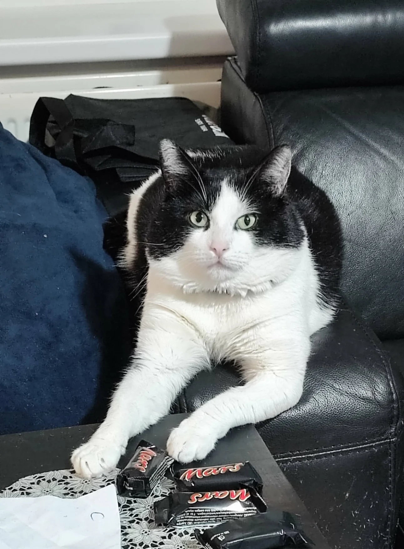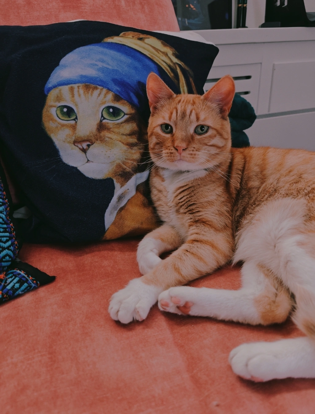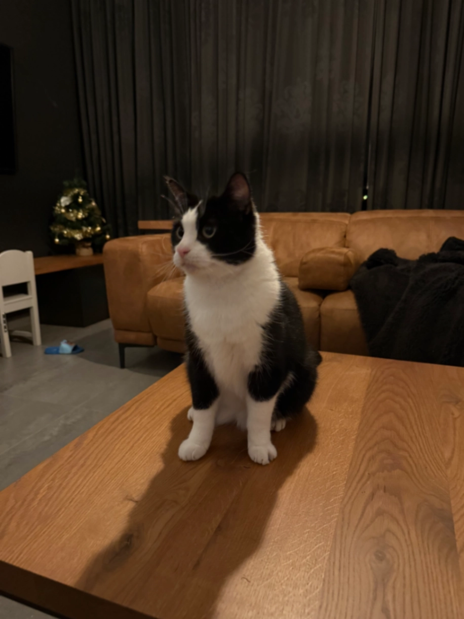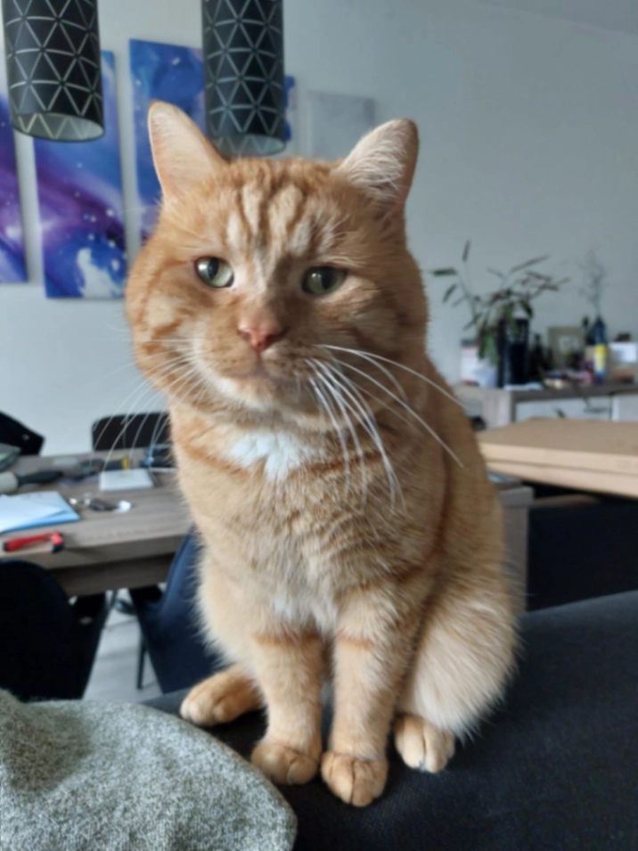 Europese korthaar kater, rood/oranje gestreept met wit met groene ogen. Witte kin, witte bef, over de borst een witte streep, witte buik. Rechtervoorpoot witte kniekous, linker voorpoot wit voetje. Achterpoten witte kniekousen. Gesteriliseerd, 7 jaar.