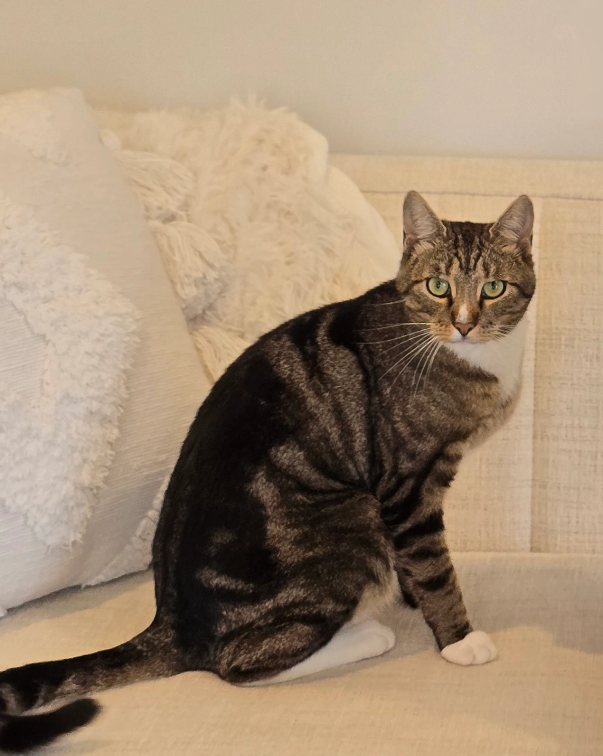 Description: Grey/brown tabby cat with distinctive dark stripes and striking green/blue eyes. Notable white/cream markings on chin, throat, and chest (white “bib”). Medium to large build with long whiskers and prominent ear tufts.