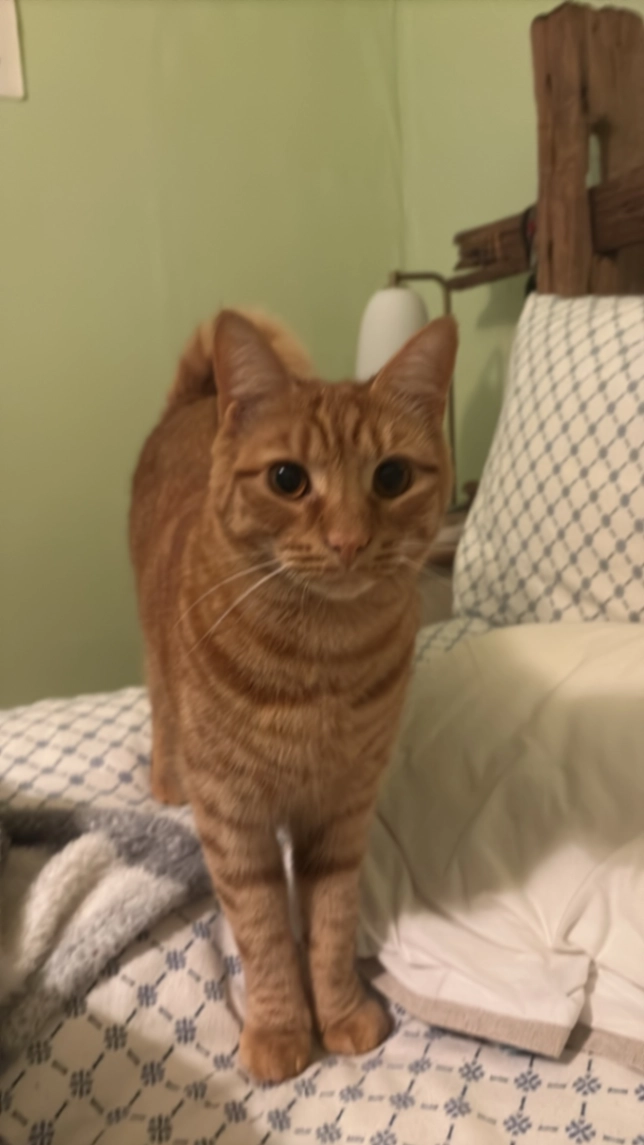 Teddy is a friendly ginger male tabby. He has a distinctive curly tail like a pug. He is an indoor cat.