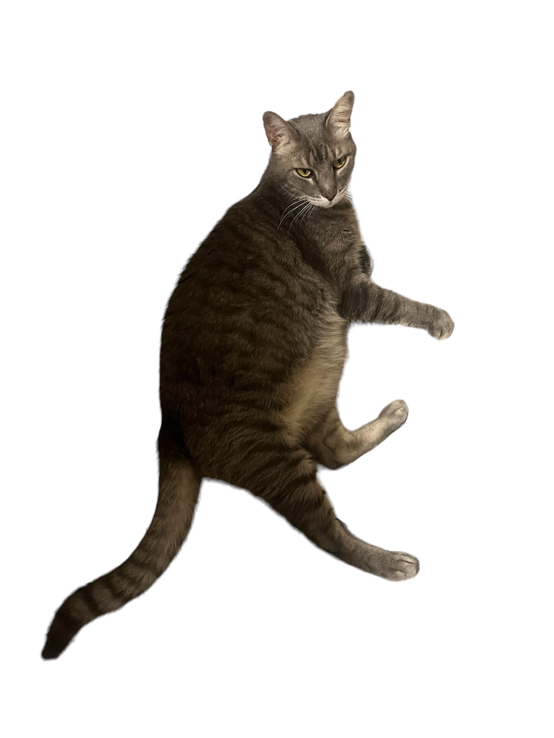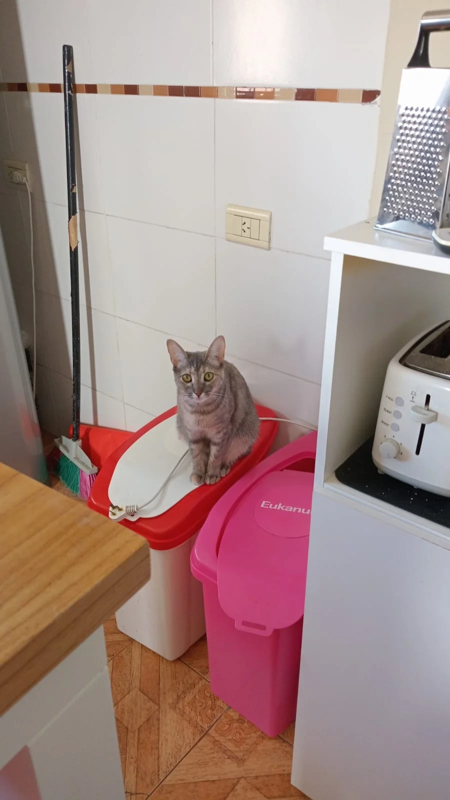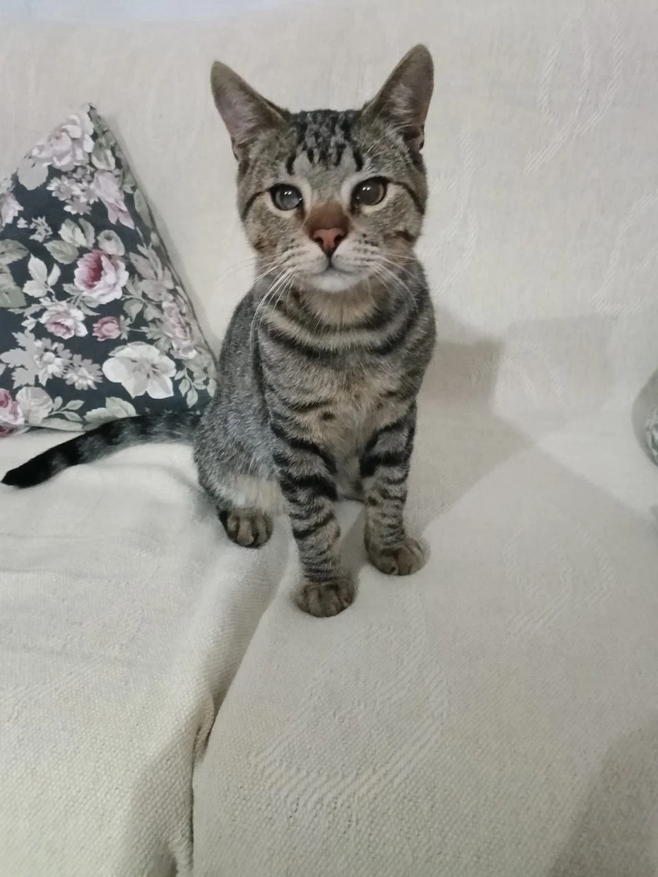 Gato blanco, sin detalles en el pelaje, patita derecha trasera renga, ojitos azules, nariz y orejas rosadas, albino