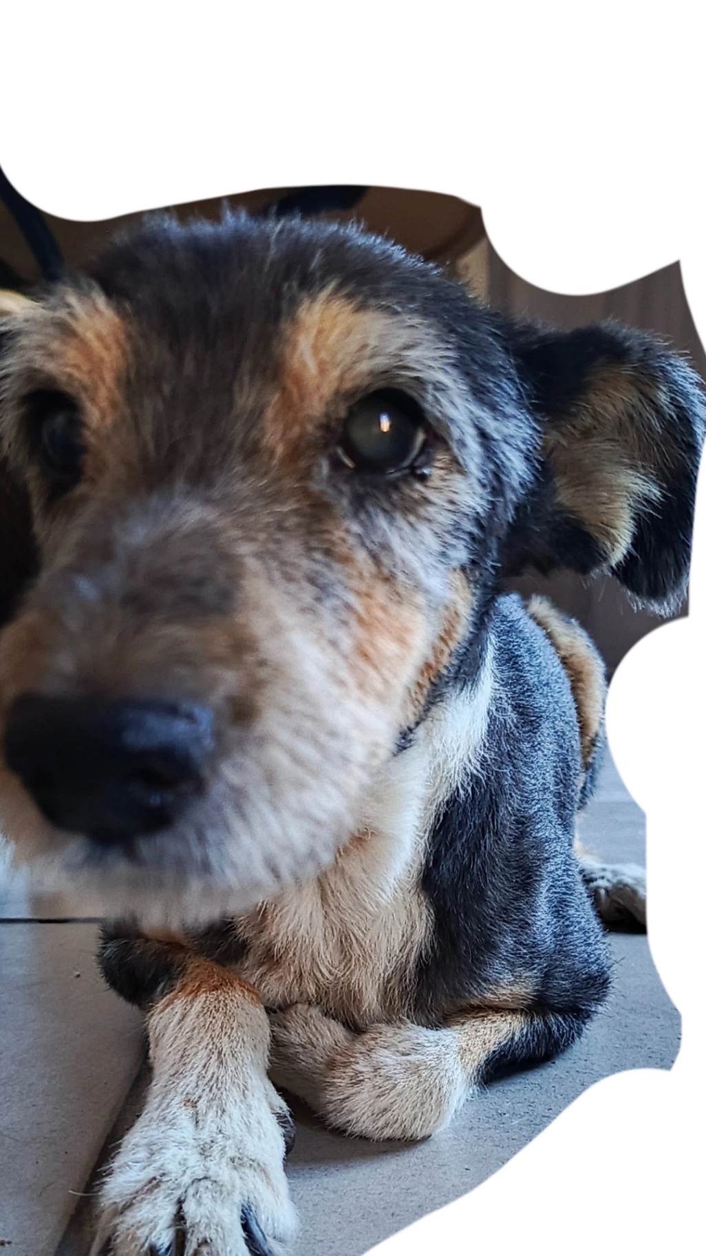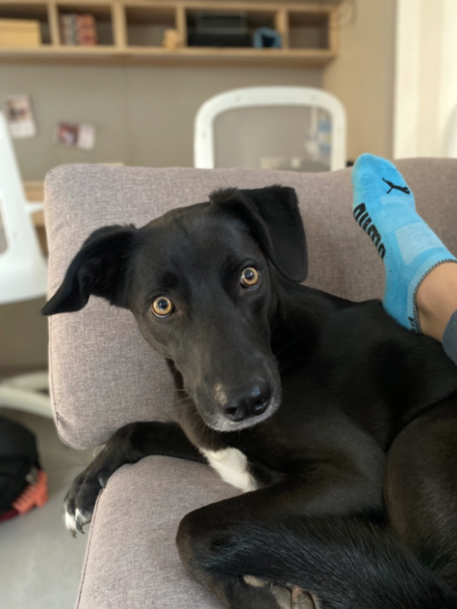 Perra viejita. Mayormente negra con patas delanteras blancas y pelaje en el cuello blanco. Peso aprox 9kg. Puede estar un poco sorda y no ve bien. Le cuesta pararse por sí sola. Está con medicación y controles veterinarios