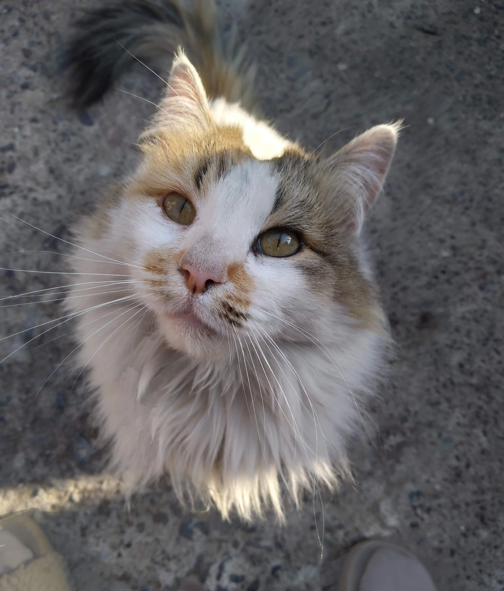 Gata blanca con manchas grises y naranjas vista por última vez en el patio de su casa
