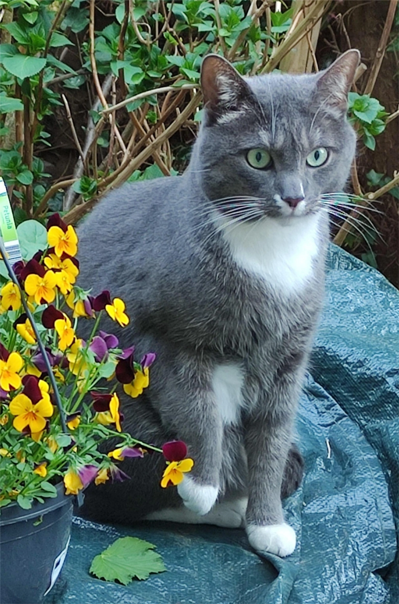Cyrus is een voornamelijk grijze kater met wit, zoals wit snorretje, witte snorharen, witte hals en bef. Witte vlek rechts onderop de buik. Voorpootjes witte teentjes, achterpootjes witte kniekousjes.