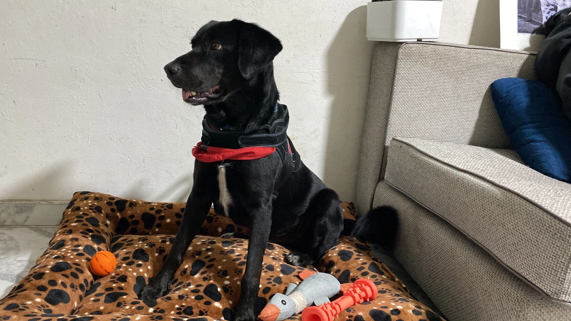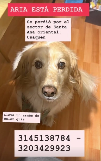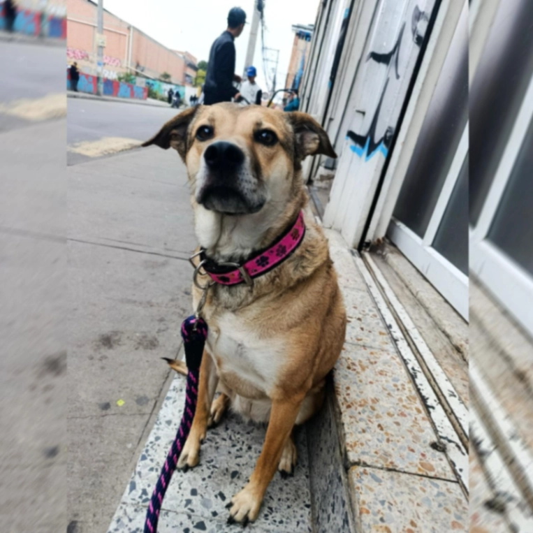 Es un perro muy amigable, también responde por su nombre, la última vez que lo vimos tenía un chaleco con detalles en azul, una pañoleta roja y un collar azul oscuro, una de sus patas tiene las dos uñas del medio de color blanco