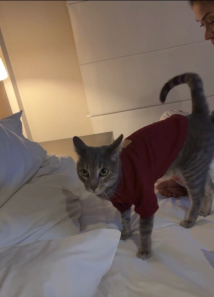 Tiene aún su collar azul y gris con moño es gris con blanco