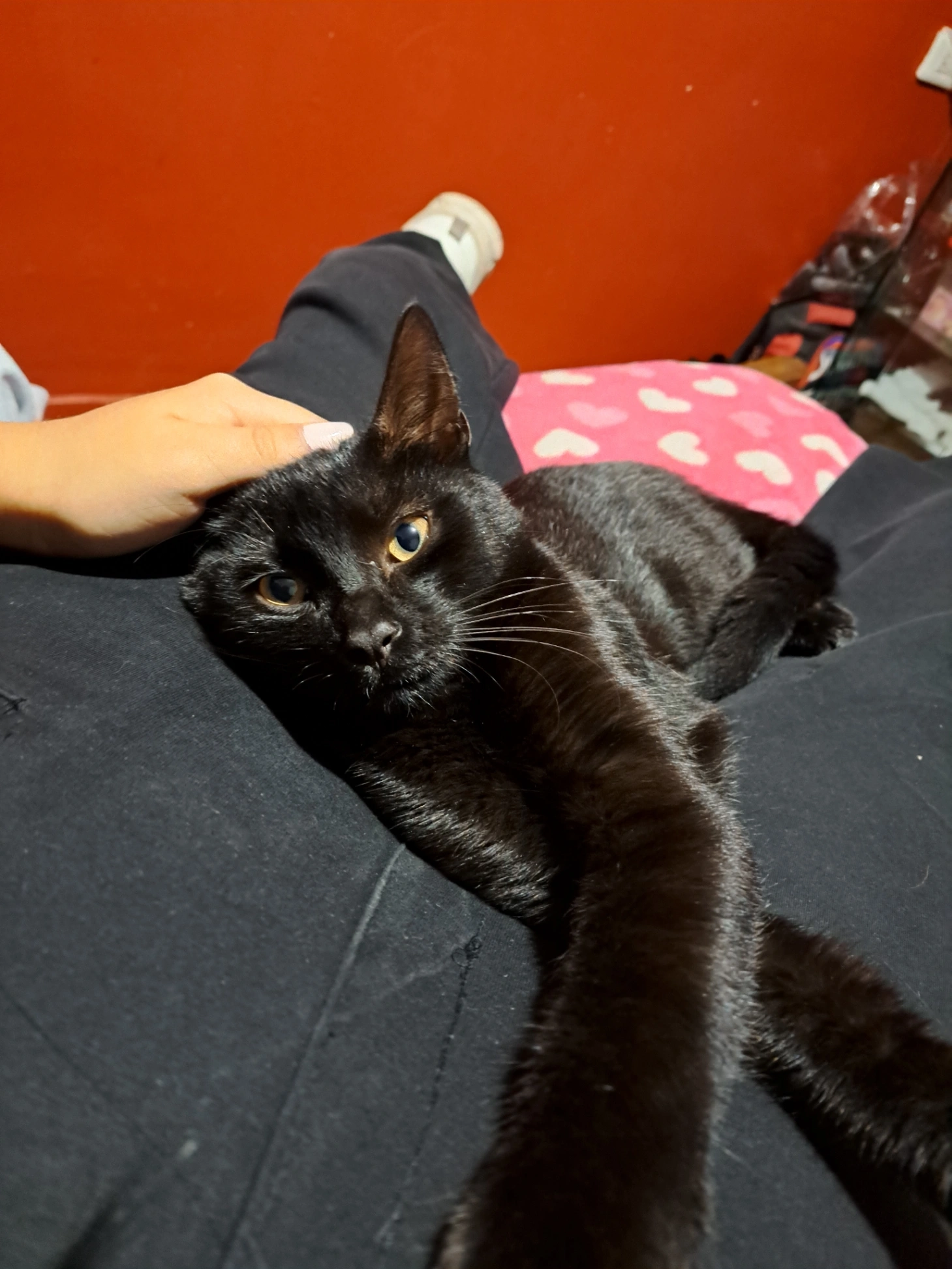 Gato con ojos color verdes, maullido agudo, no tenía collar, tiene microchip
