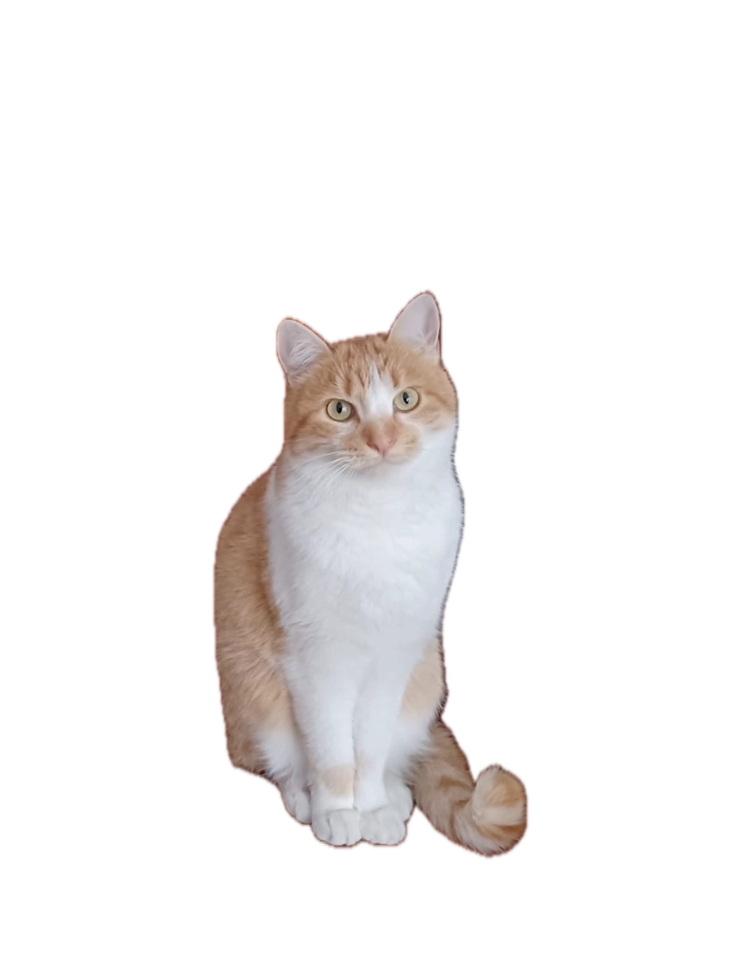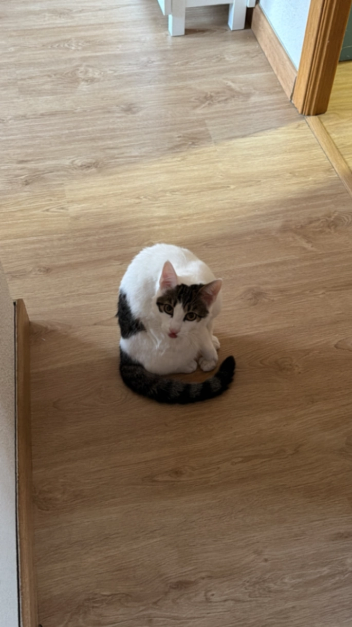 Es un gatito blanco con una manchita negra en el lomo, la cola también negra y su carita tiene una mancha como antifaz. Tiene un collarcito celeste con blanco, tiene 8 meses. Es súper cariñoso