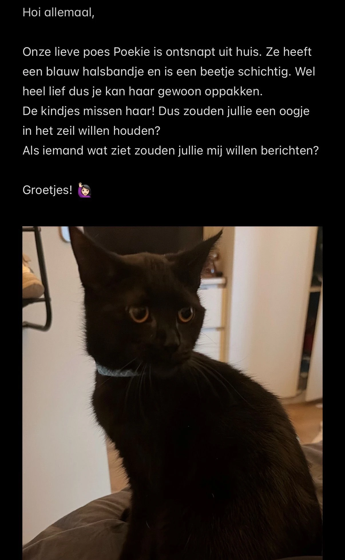 Heb je Spooky misschien gezien? We zijn erg bezorgd. Zou je alsjeblieft in je garage, schuur, zolder, tuin en op je terras willen kijken?