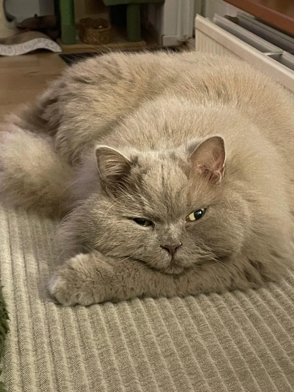 Swiepje is een binnenkat en heeft een beige kleurige vacht. Er zitten wat kale plekken in de vacht na klitverwijdering. Hij is een bangerik maar enorm lief. Hij is nu 10 jaar en wordt enorm gemist door het gezin en de andere kat