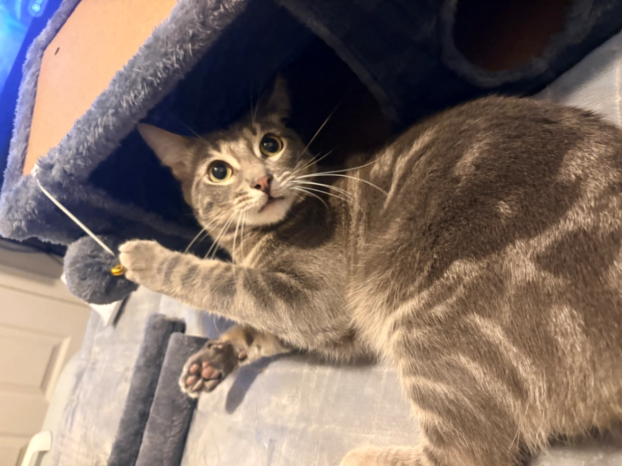 Gray Tabby Cat, 1 year and a half old, he is in the smaller side and is thin.