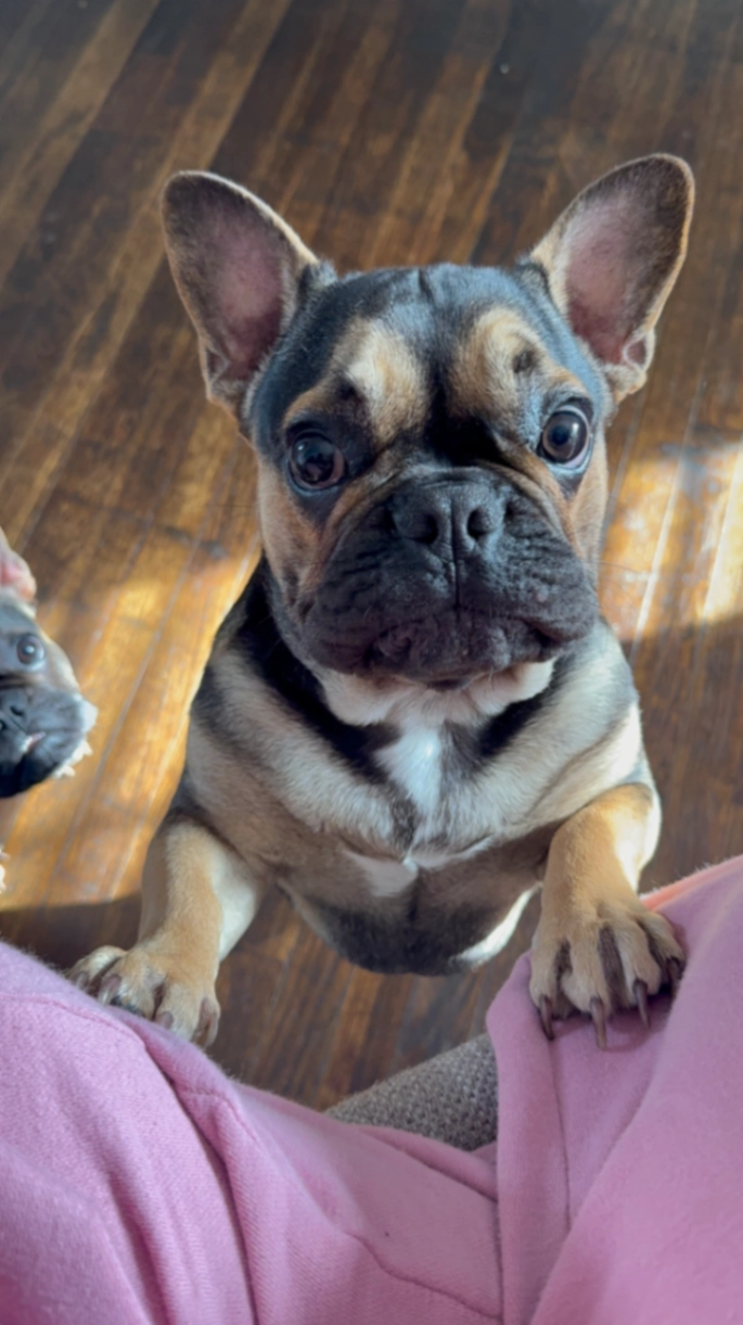 Miko is described as a black French bulldog with tan markings on his face, tan paws, and a white blaze or his chest.