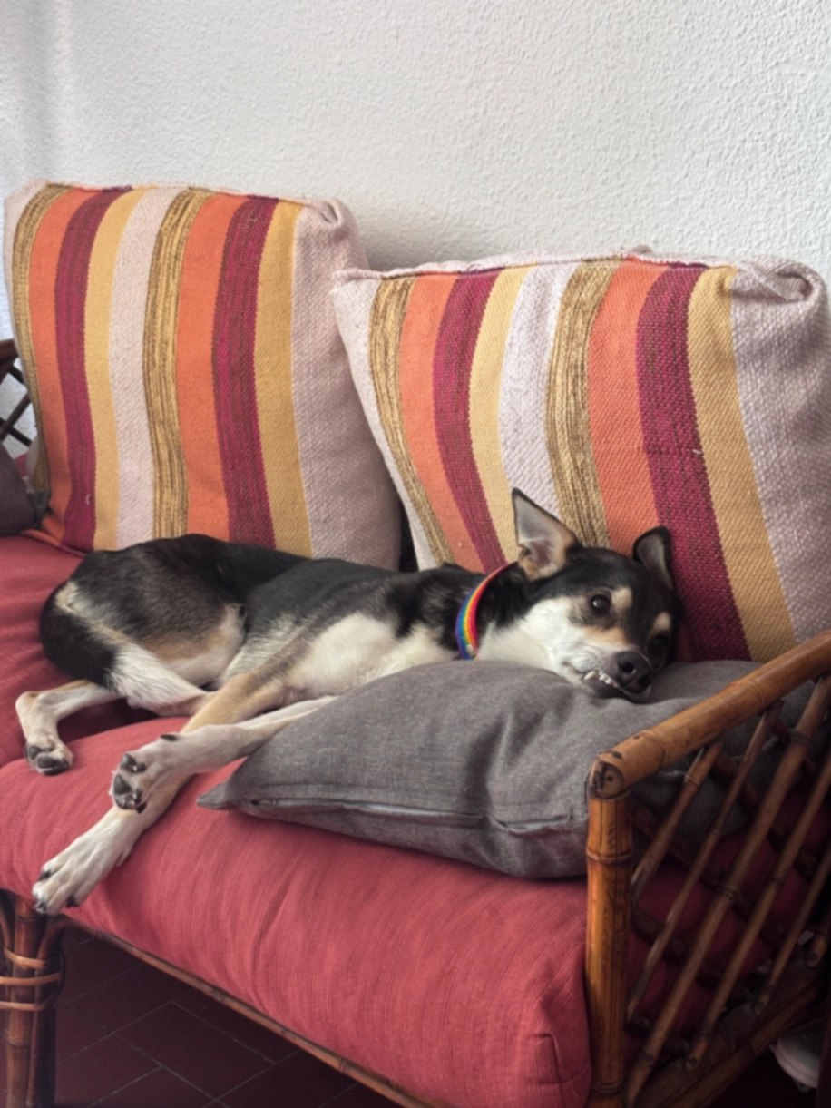 Huesos se escapo de casa el 24/12 a la noche. Lleva un collar de arcoiris. Es un macho castrado, mediano y flaco tipo galgo, pelaje negro, blanco y manchas marrones en las patas, tiene la punta de la cola blanca y orejas grandes