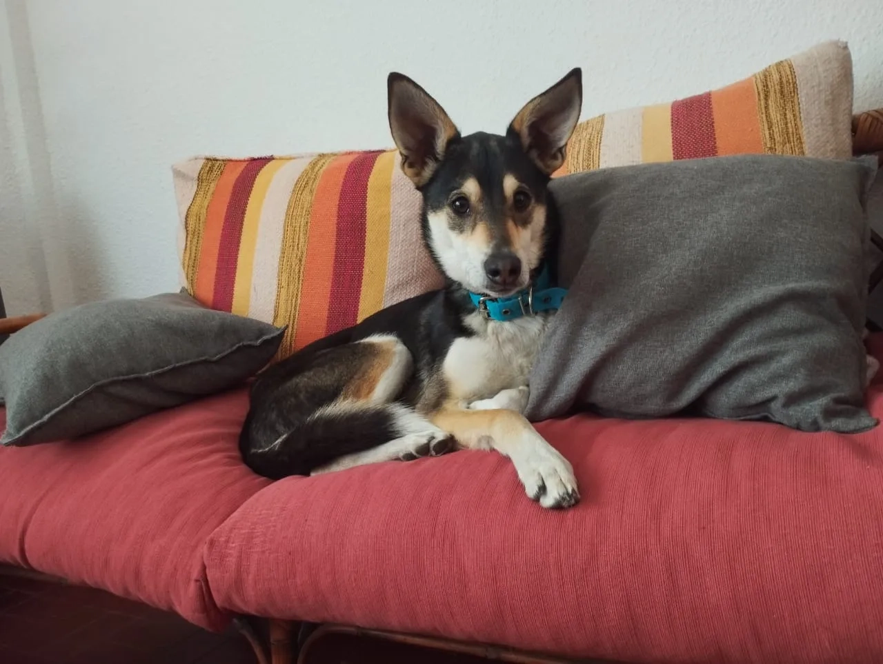 Tiene collar multi color, es macho, está castrado, alto y largo y tiene una marchita blanca en la punta de la cola.
