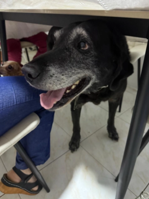 Hercules es un perro medio ciego tiene 13 años tiene tumores en el cuerpo. Responde con un silbido y su dueña es una niña de 10 años. Labrador negro y canoso su ocico blanco algunas patas manchadas a blancas.