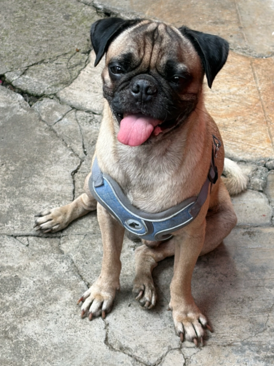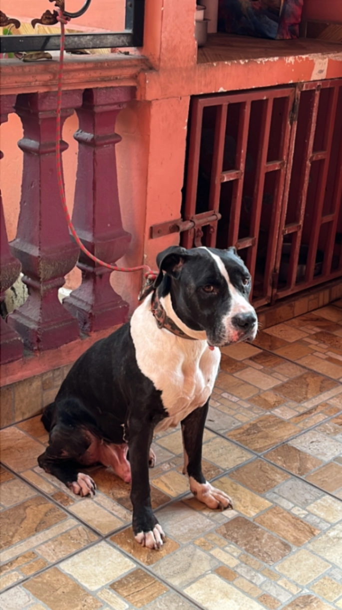 Aquiles es pitbull ya grande, negro con pecho y frente con mancha color blanco, recibe tratamiento de quimioterapia por tumorcitos en la piel y Daga es una perra de unos 7 años de edad, café claro, con un tipo antifaz alrededor de ojos (por el color obscuro).