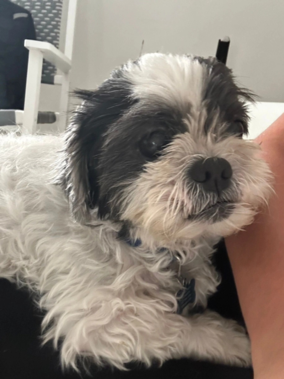 13 years old, around 13 lbs. shih tzu, blind and hard of hearing. Big spot on his back, and on his tail. Like the ones on his head.